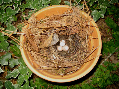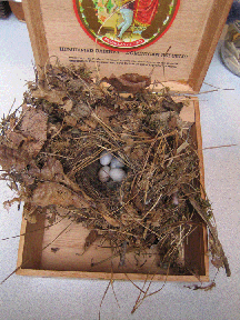March 2006In the spring of 2006 we made a service call to our cable company because we were getting poor reception. When they came out they found this bluebird nest and told me it had to go. I thought I would just put it back when they left, but they locked me out. I considered breaking back into the box to replace the nest but thought better of it. An hour passed and they returned unexpectedly. I think they half expected that I would replace the nest. It breaks my heart that the mother bird was separated from her delicate clutch of eggs, but truth be told the nest was only two feet from the ground and my cat Prince would have made short work of her fledglings. Perhaps it was a gentler mercy that the nest was found.