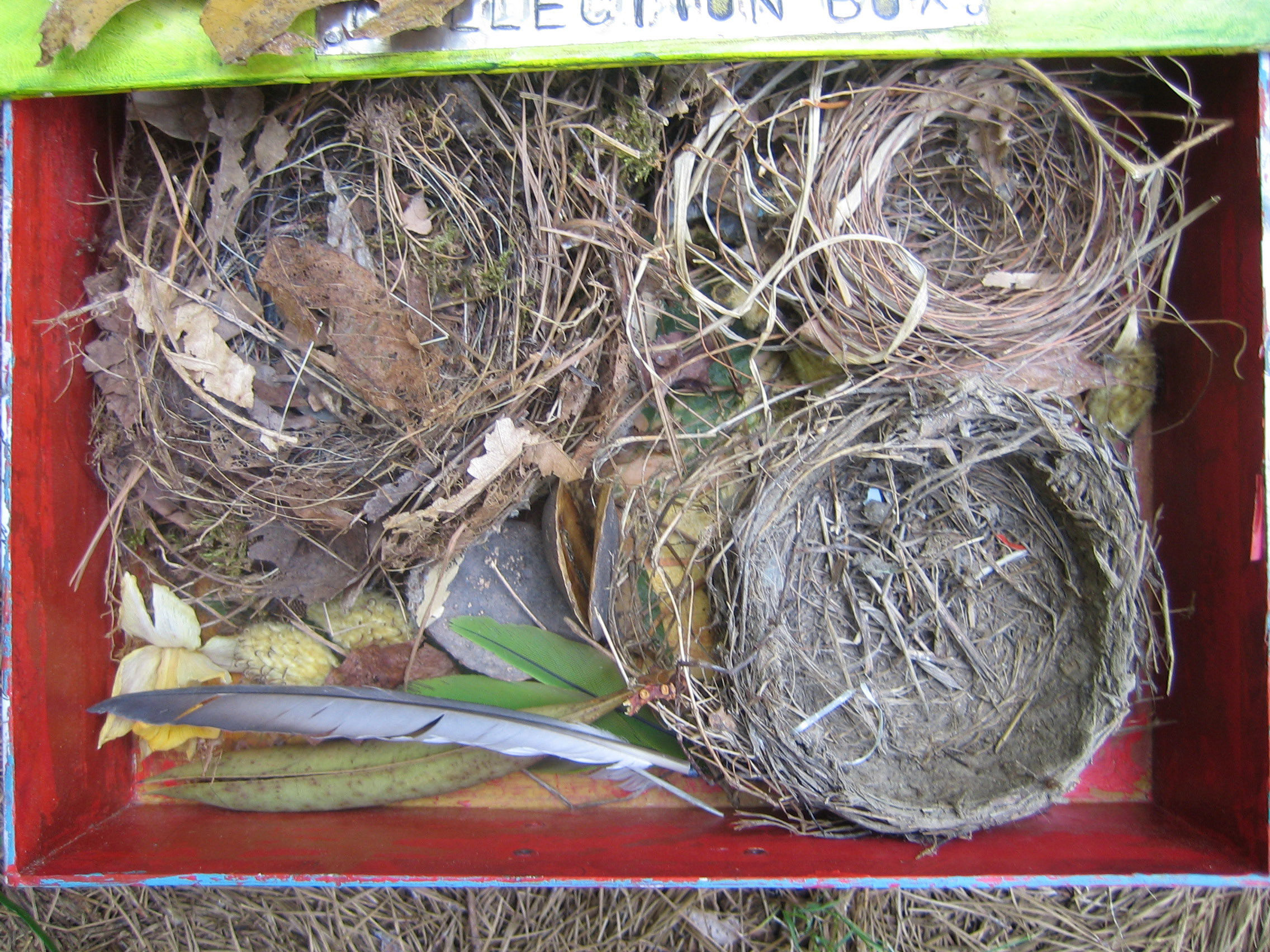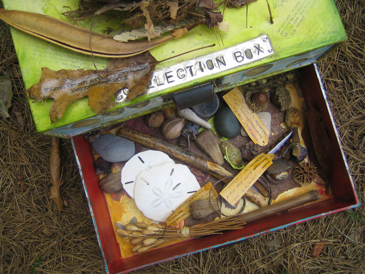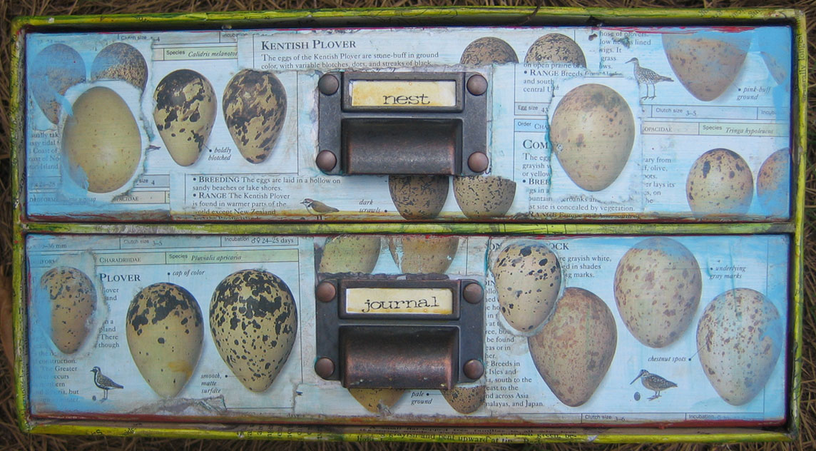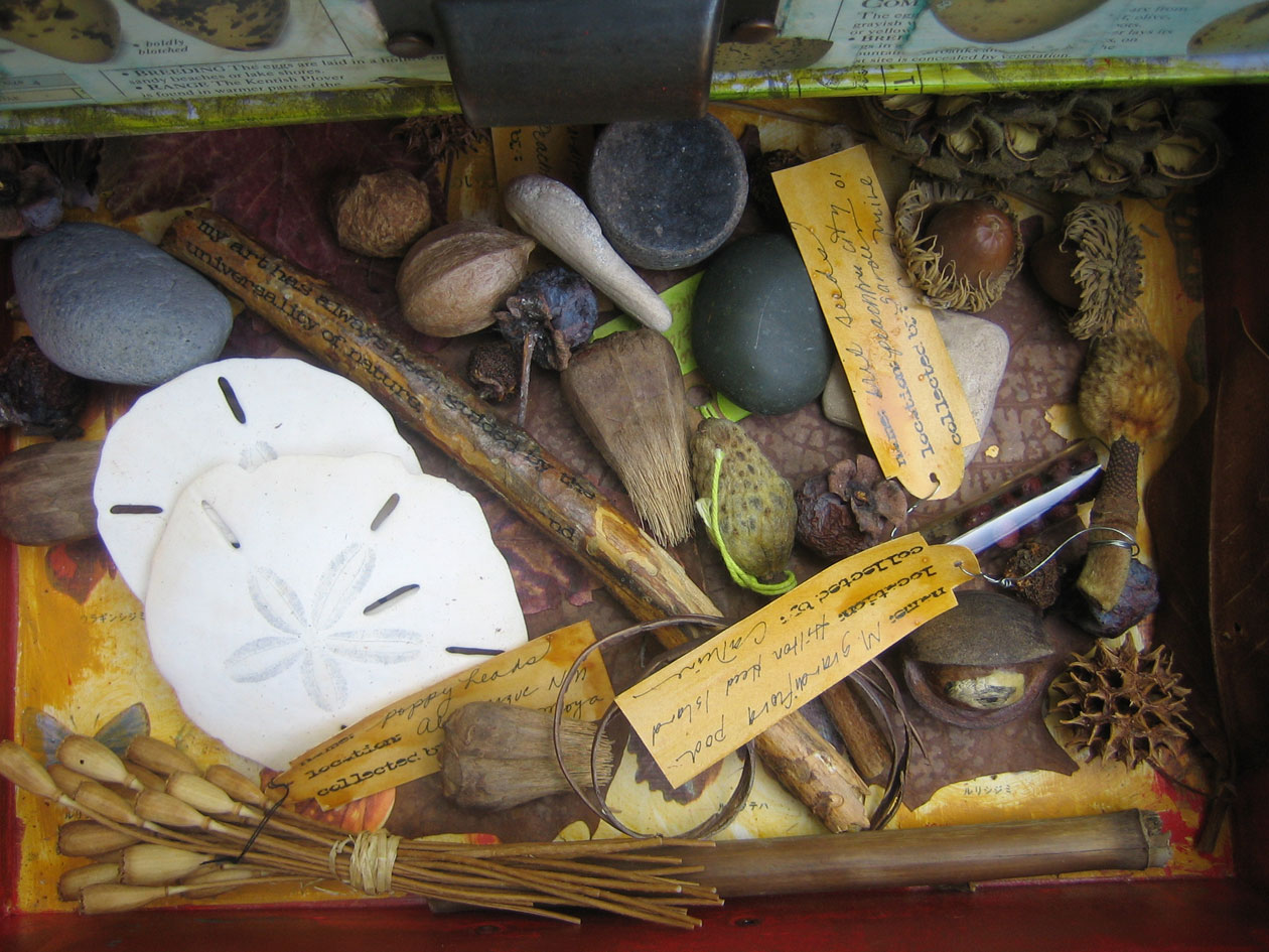 A collection of treasures found during a walk along the shore, a mountain trail, or upon the forest floor. A feather, a shell, an acorn or . . . This particular box was included in my artist portfolio back in 2001 when the Art Doll Chronicles was published. I was always secretly disappointed because you couldn't see what I had placed inside the drawers.